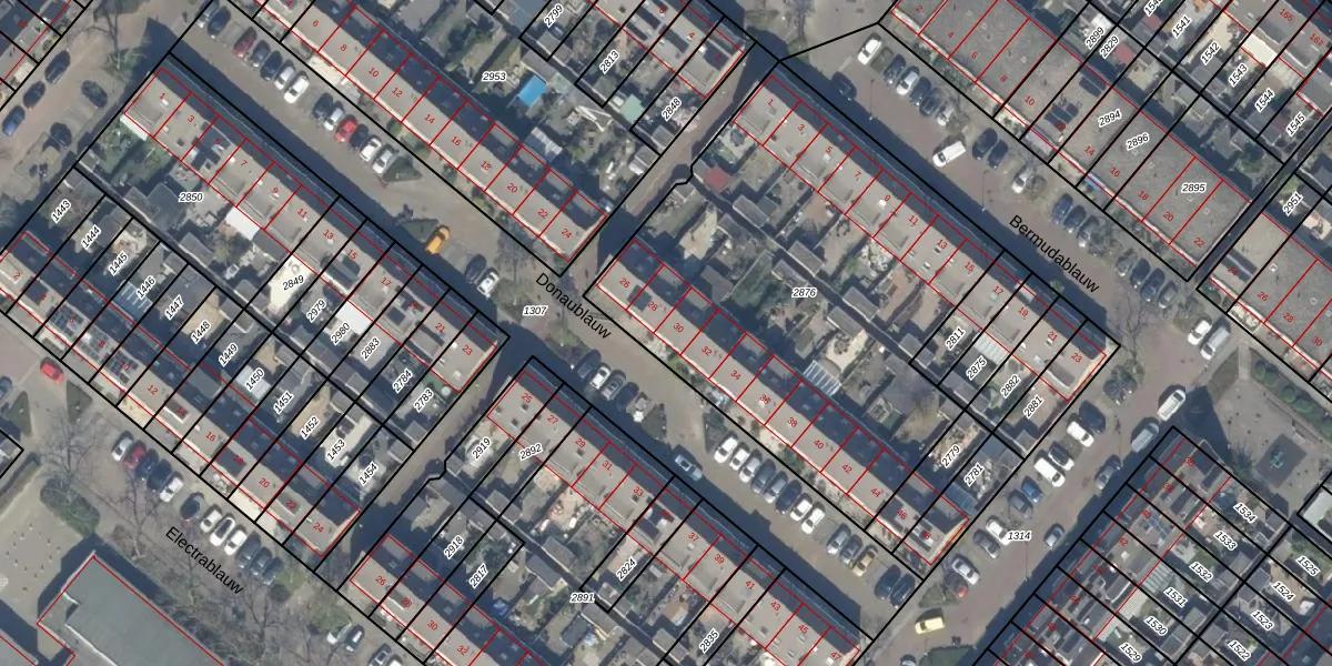 Het perceel waarop Donaublauw 30 staat heeft een oppervlakte van 2283 m². Dit is een zeer groot perceel. De perceeloppervlakte wordt geregistreerd door het Kadaster. Gedetailleerde informatie over de maten van dit perceel kunt u vinden in het rapport Kadastrale kaart met maatvoering van Donaublauw 30.