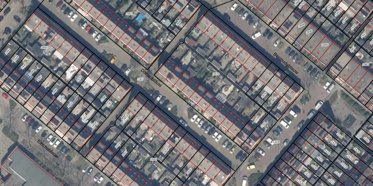 Het perceel waarop Donaublauw 32 staat heeft een oppervlakte van 2283 m². Dit is een zeer groot perceel. De perceeloppervlakte wordt geregistreerd door het Kadaster. Gedetailleerde informatie over de maten van dit perceel kunt u vinden in het rapport Kadastrale kaart met maatvoering van Donaublauw 32.