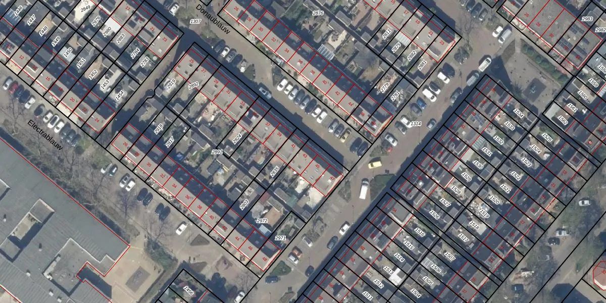 Het perceel waarop Donaublauw 43 staat heeft een oppervlakte van 639 m². Dit is een groot perceel. De perceeloppervlakte wordt geregistreerd door het Kadaster. Gedetailleerde informatie over de maten van dit perceel kunt u vinden in het rapport Kadastrale kaart met maatvoering van Donaublauw 43.