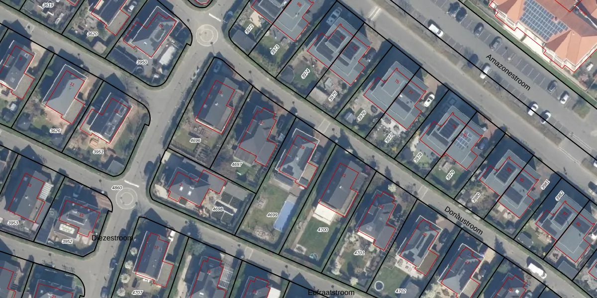 Het perceel waarop Donaustroom 19 staat heeft een oppervlakte van 694 m². Dit is een groot perceel. De perceeloppervlakte wordt geregistreerd door het Kadaster. Gedetailleerde informatie over de maten van dit perceel kunt u vinden in het rapport Kadastrale kaart met maatvoering van Donaustroom 19.