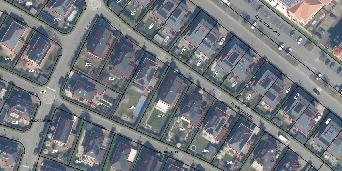 Het perceel waarop Donaustroom 21 staat heeft een oppervlakte van 643 m². Dit is een groot perceel. De perceeloppervlakte wordt geregistreerd door het Kadaster. Gedetailleerde informatie over de maten van dit perceel kunt u vinden in het rapport Kadastrale kaart met maatvoering van Donaustroom 21.