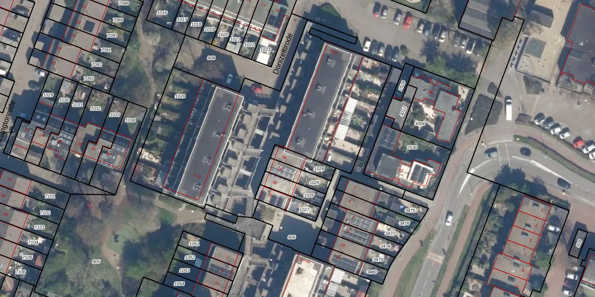 Het perceel waarop Donizettirode 32 staat heeft een oppervlakte van 2983 m². Dit is een zeer groot perceel. De perceeloppervlakte wordt geregistreerd door het Kadaster. Gedetailleerde informatie over de maten van dit perceel kunt u vinden in het rapport Kadastrale kaart met maatvoering van Donizettirode 32.