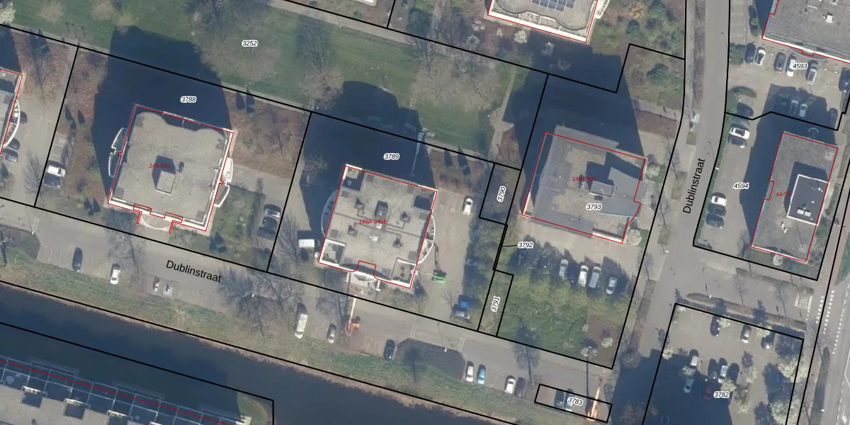 Het perceel waarop Dublinstraat 199-A staat heeft een oppervlakte van 1904 m². Dit is een zeer groot perceel. De perceeloppervlakte wordt geregistreerd door het Kadaster. Gedetailleerde informatie over de maten van dit perceel kunt u vinden in het rapport Kadastrale kaart met maatvoering van Dublinstraat 199-A.