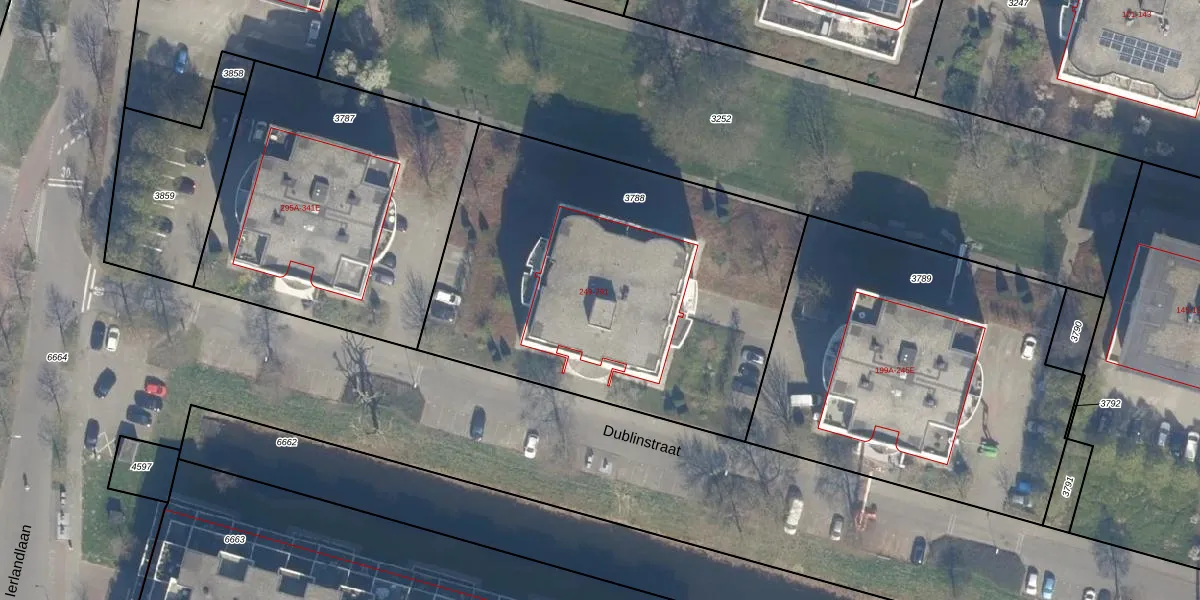 Het perceel waarop Dublinstraat 267 staat heeft een oppervlakte van 2220 m². Dit is een zeer groot perceel. De perceeloppervlakte wordt geregistreerd door het Kadaster. Gedetailleerde informatie over de maten van dit perceel kunt u vinden in het rapport Kadastrale kaart met maatvoering van Dublinstraat 267.