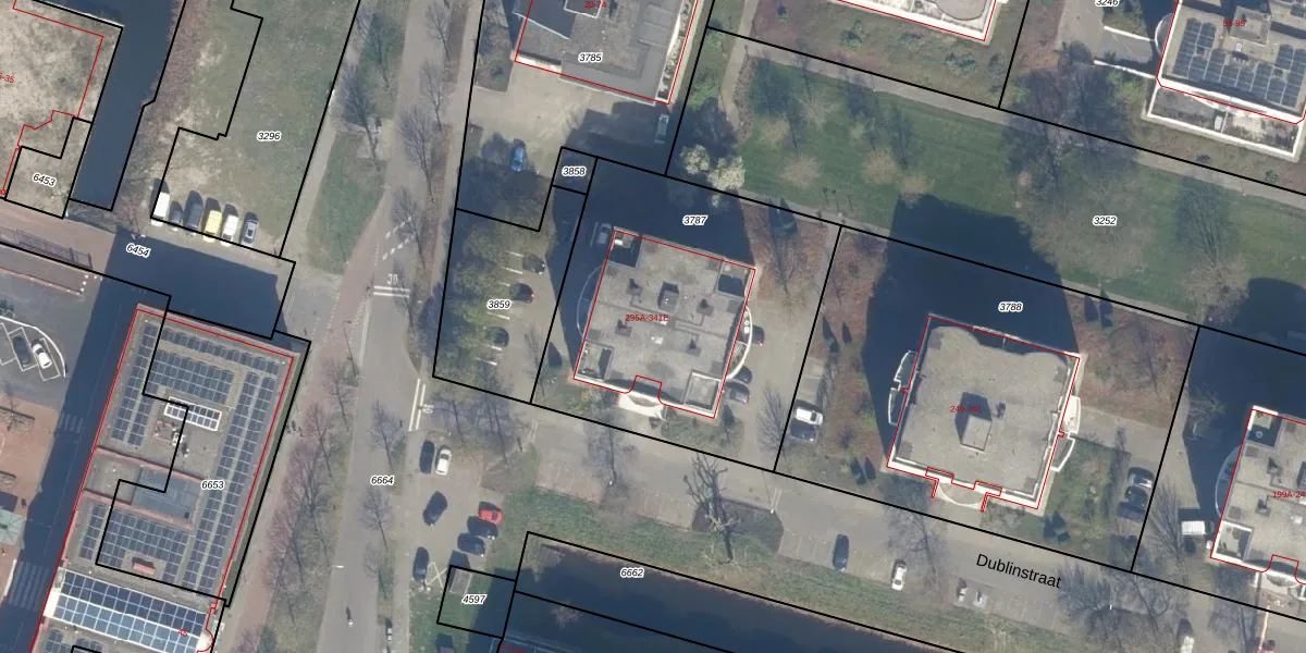 Het perceel waarop Dublinstraat 323 staat heeft een oppervlakte van 1515 m². Dit is een zeer groot perceel. De perceeloppervlakte wordt geregistreerd door het Kadaster. Gedetailleerde informatie over de maten van dit perceel kunt u vinden in het rapport Kadastrale kaart met maatvoering van Dublinstraat 323.