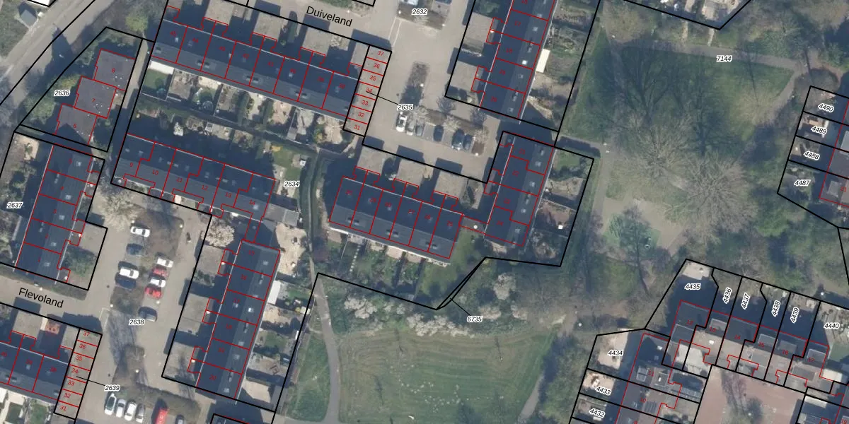 Het perceel waarop Duiveland 26 staat heeft een oppervlakte van 5318 m². Dit is een zeer groot perceel. De perceeloppervlakte wordt geregistreerd door het Kadaster. Gedetailleerde informatie over de maten van dit perceel kunt u vinden in het rapport Kadastrale kaart met maatvoering van Duiveland 26.