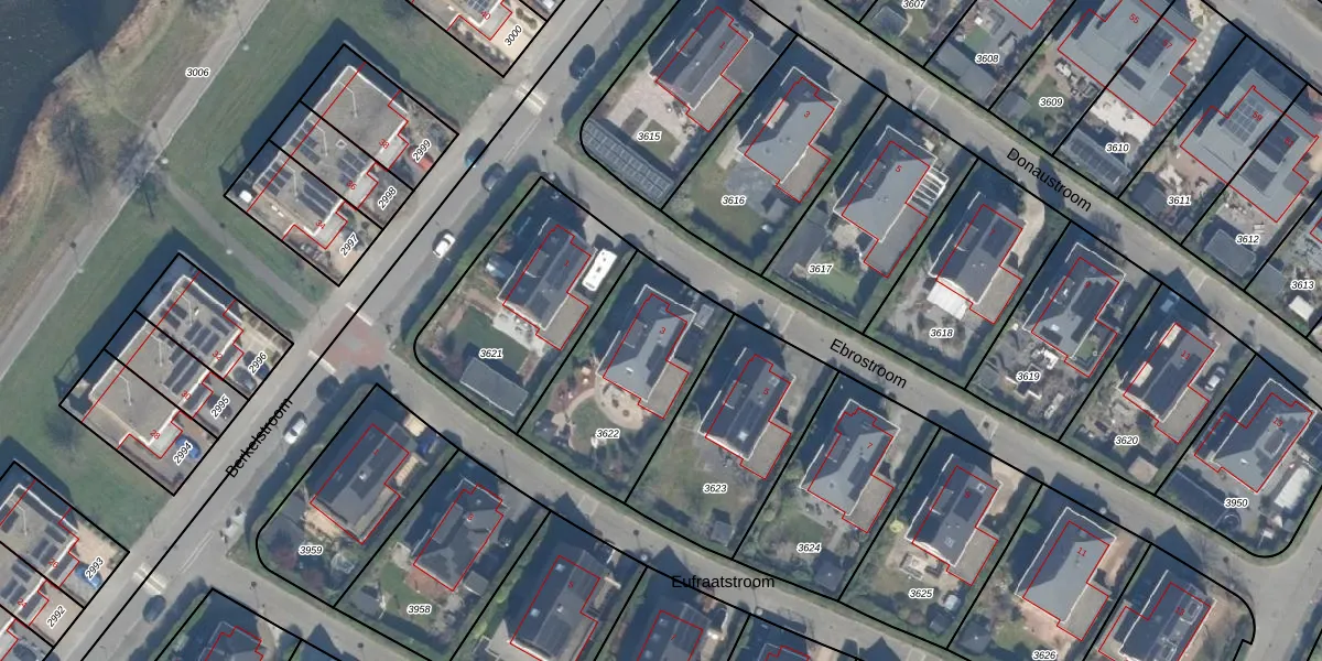 Het perceel waarop Ebrostroom 3 staat heeft een oppervlakte van 616 m². Dit is een groot perceel. De perceeloppervlakte wordt geregistreerd door het Kadaster. Gedetailleerde informatie over de maten van dit perceel kunt u vinden in het rapport Kadastrale kaart met maatvoering van Ebrostroom 3.