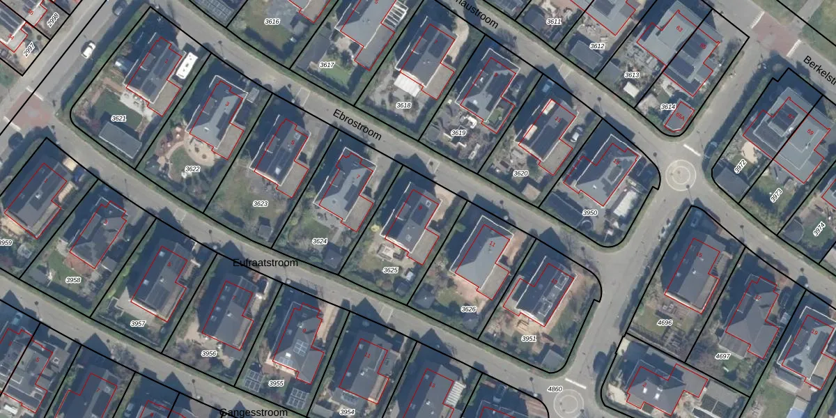 Het perceel waarop Ebrostroom 9 staat heeft een oppervlakte van 532 m². Dit is een groot perceel. De perceeloppervlakte wordt geregistreerd door het Kadaster. Gedetailleerde informatie over de maten van dit perceel kunt u vinden in het rapport Kadastrale kaart met maatvoering van Ebrostroom 9.