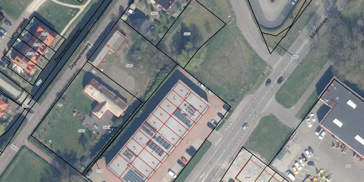 Edisonstraat 3-V is gelegen op kadastraal perceel ZWD01F5514. Deze kadastrale aanduiding is uniek en wordt gebruikt door het Kadaster om eigendomsrechten en andere zakelijke rechten vast te leggen. Het perceel maakt onderdeel uit van de kadastrale gemeente Zegwaard.