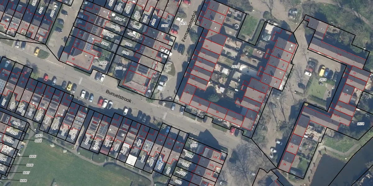 Het perceel waarop Fernandelstrook 20 staat heeft een oppervlakte van 2855 m². Dit is een zeer groot perceel. De perceeloppervlakte wordt geregistreerd door het Kadaster. Gedetailleerde informatie over de maten van dit perceel kunt u vinden in het rapport Kadastrale kaart met maatvoering van Fernandelstrook 20.