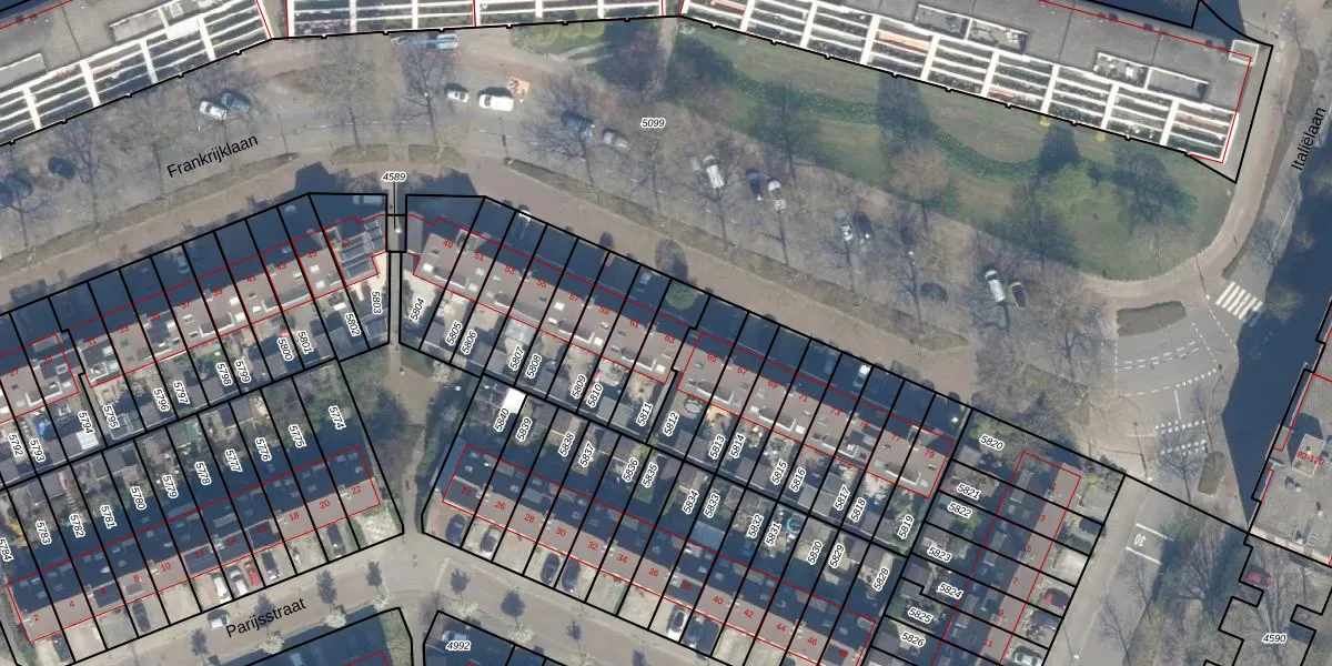Het perceel waarop Frankrijklaan 63 staat heeft een oppervlakte van 149 m². Dit is een middelgroot perceel. De perceeloppervlakte wordt geregistreerd door het Kadaster. Gedetailleerde informatie over de maten van dit perceel kunt u vinden in het rapport Kadastrale kaart met maatvoering van Frankrijklaan 63.
