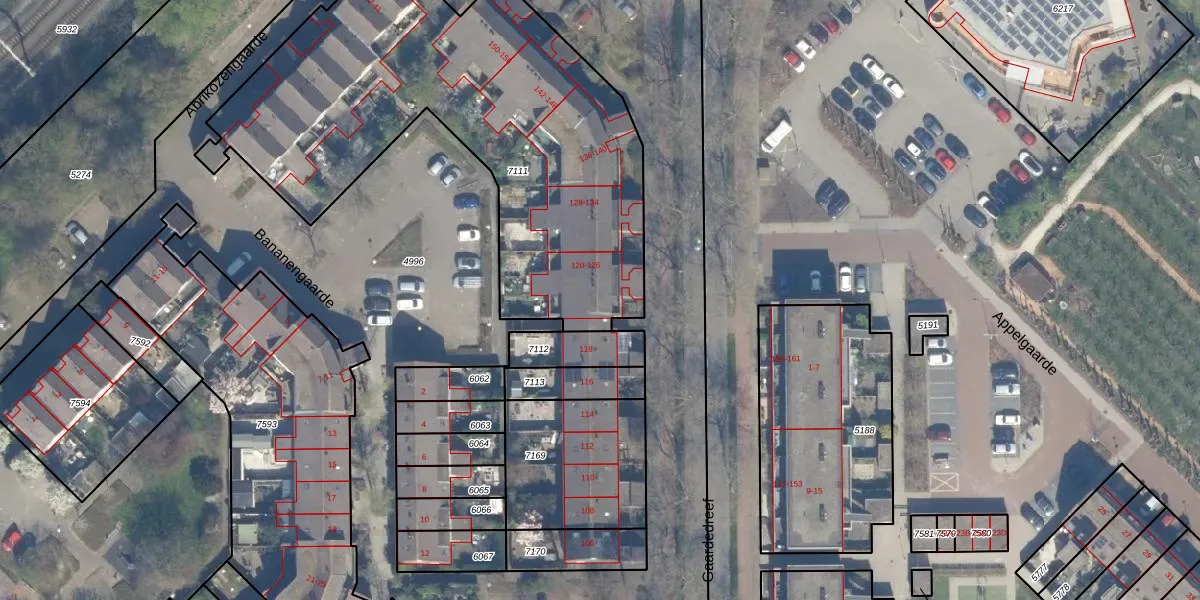 Het perceel waarop Gaardedreef 122 staat heeft een oppervlakte van 2317 m². Dit is een zeer groot perceel. De perceeloppervlakte wordt geregistreerd door het Kadaster. Gedetailleerde informatie over de maten van dit perceel kunt u vinden in het rapport Kadastrale kaart met maatvoering van Gaardedreef 122.