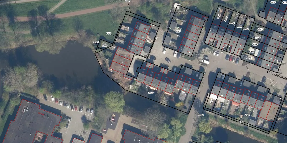 Het perceel waarop Gershwinrode 57 staat heeft een oppervlakte van 2254 m². Dit is een zeer groot perceel. De perceeloppervlakte wordt geregistreerd door het Kadaster. Gedetailleerde informatie over de maten van dit perceel kunt u vinden in het rapport Kadastrale kaart met maatvoering van Gershwinrode 57.