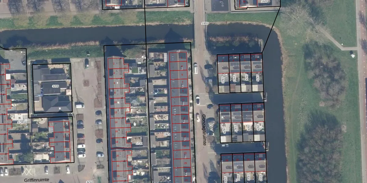 Het perceel waarop Gonzagaruimte 9 staat heeft een oppervlakte van 2481 m². Dit is een zeer groot perceel. De perceeloppervlakte wordt geregistreerd door het Kadaster. Gedetailleerde informatie over de maten van dit perceel kunt u vinden in het rapport Kadastrale kaart met maatvoering van Gonzagaruimte 9.