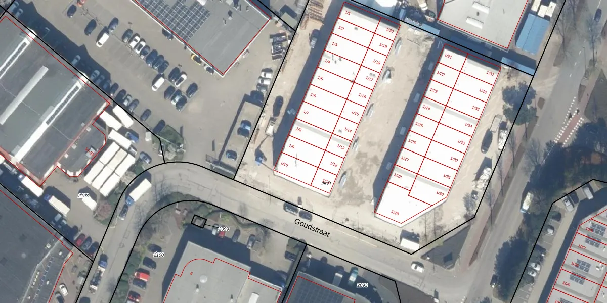 Het perceel waarop Goudstraat 1-9 staat heeft een oppervlakte van 5303 m². Dit is een zeer groot perceel. De perceeloppervlakte wordt geregistreerd door het Kadaster. Gedetailleerde informatie over de maten van dit perceel kunt u vinden in het rapport Kadastrale kaart met maatvoering van Goudstraat 1-9.