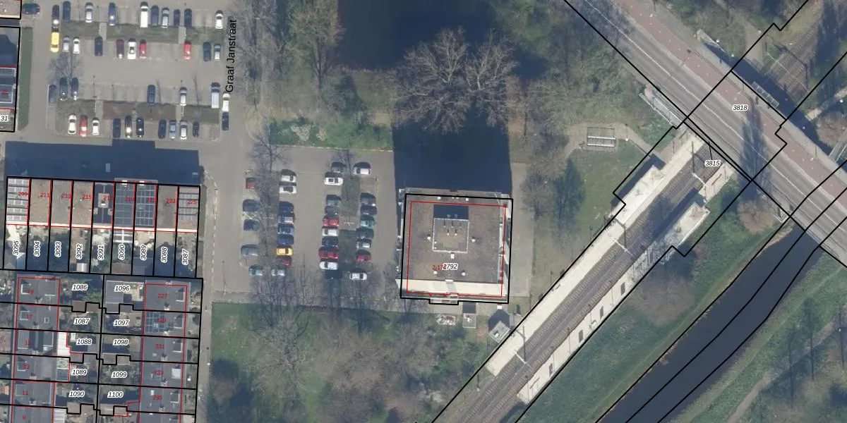 Het perceel waarop Graaf Janstraat 12 staat heeft een oppervlakte van 637 m². Dit is een groot perceel. De perceeloppervlakte wordt geregistreerd door het Kadaster. Gedetailleerde informatie over de maten van dit perceel kunt u vinden in het rapport Kadastrale kaart met maatvoering van Graaf Janstraat 12.