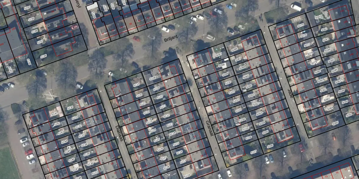 Het perceel waarop Granaat 5 staat heeft een oppervlakte van 119 m². Dit is een middelgroot perceel. De perceeloppervlakte wordt geregistreerd door het Kadaster. Gedetailleerde informatie over de maten van dit perceel kunt u vinden in het rapport Kadastrale kaart met maatvoering van Granaat 5.