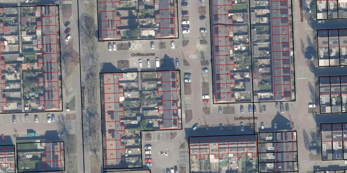 Het perceel waarop Griffinruimte 19 staat heeft een oppervlakte van 2044 m². Dit is een zeer groot perceel. De perceeloppervlakte wordt geregistreerd door het Kadaster. Gedetailleerde informatie over de maten van dit perceel kunt u vinden in het rapport Kadastrale kaart met maatvoering van Griffinruimte 19.
