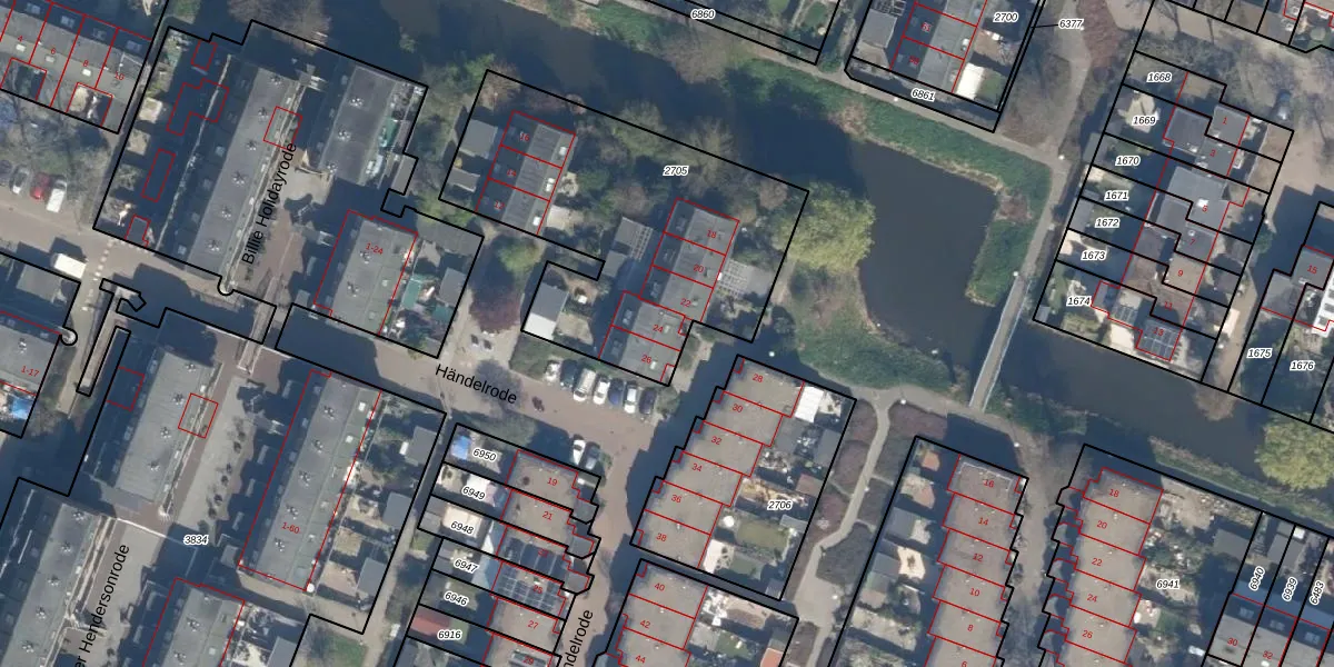 Het perceel waarop Händelrode 24 staat heeft een oppervlakte van 1405 m². Dit is een zeer groot perceel. De perceeloppervlakte wordt geregistreerd door het Kadaster. Gedetailleerde informatie over de maten van dit perceel kunt u vinden in het rapport Kadastrale kaart met maatvoering van Händelrode 24.