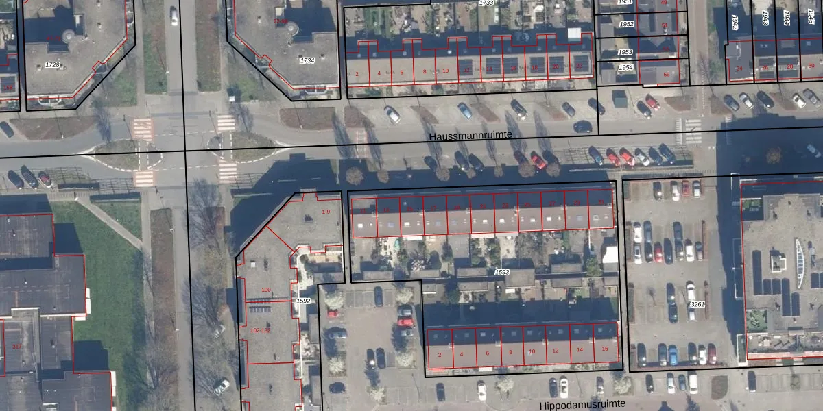Het perceel waarop Haussmannruimte 15 staat heeft een oppervlakte van 2600 m². Dit is een zeer groot perceel. De perceeloppervlakte wordt geregistreerd door het Kadaster. Gedetailleerde informatie over de maten van dit perceel kunt u vinden in het rapport Kadastrale kaart met maatvoering van Haussmannruimte 15.