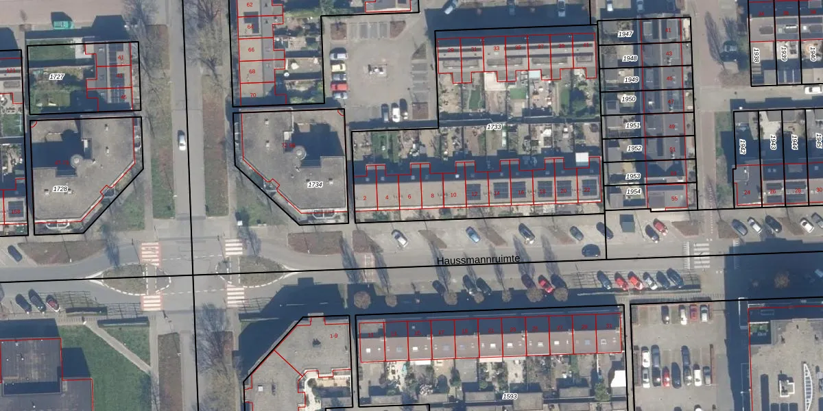 Het perceel waarop Haussmannruimte 6 staat heeft een oppervlakte van 2292 m². Dit is een zeer groot perceel. De perceeloppervlakte wordt geregistreerd door het Kadaster. Gedetailleerde informatie over de maten van dit perceel kunt u vinden in het rapport Kadastrale kaart met maatvoering van Haussmannruimte 6.