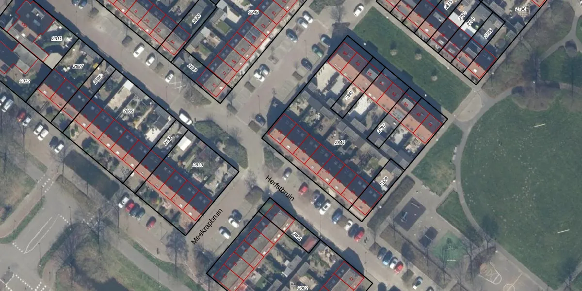 Het perceel waarop Herfstbruin 18 staat heeft een oppervlakte van 1669 m². Dit is een zeer groot perceel. De perceeloppervlakte wordt geregistreerd door het Kadaster. Gedetailleerde informatie over de maten van dit perceel kunt u vinden in het rapport Kadastrale kaart met maatvoering van Herfstbruin 18.