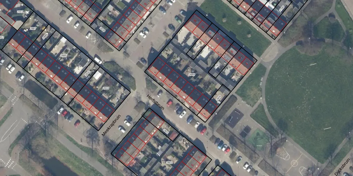 Het perceel waarop Herfstbruin 22 staat heeft een oppervlakte van 1669 m². Dit is een zeer groot perceel. De perceeloppervlakte wordt geregistreerd door het Kadaster. Gedetailleerde informatie over de maten van dit perceel kunt u vinden in het rapport Kadastrale kaart met maatvoering van Herfstbruin 22.