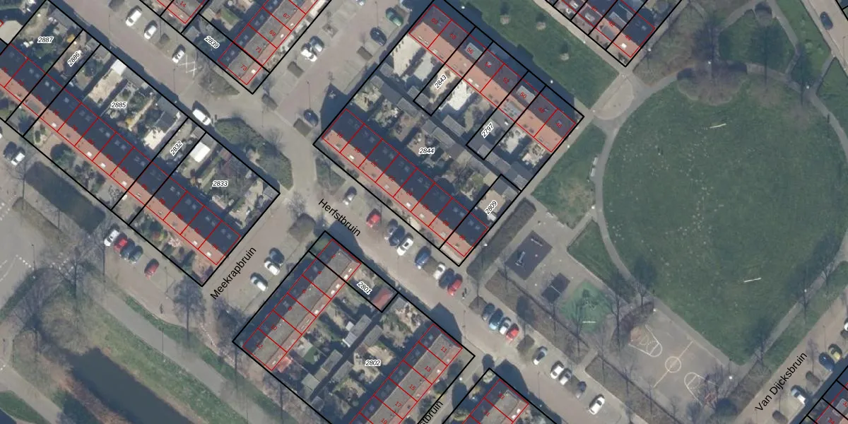 Het perceel waarop Herfstbruin 26 staat heeft een oppervlakte van 1669 m². Dit is een zeer groot perceel. De perceeloppervlakte wordt geregistreerd door het Kadaster. Gedetailleerde informatie over de maten van dit perceel kunt u vinden in het rapport Kadastrale kaart met maatvoering van Herfstbruin 26.