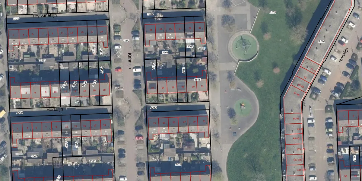 Gebruik de zoekbalk of klik op een perceel voor informatie over de adressen binnen dit perceel.