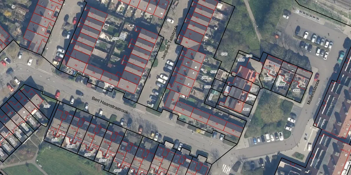 Het perceel waarop Jacques Tatistrook 46 staat heeft een oppervlakte van 2023 m². Dit is een zeer groot perceel. De perceeloppervlakte wordt geregistreerd door het Kadaster. Gedetailleerde informatie over de maten van dit perceel kunt u vinden in het rapport Kadastrale kaart met maatvoering van Jacques Tatistrook 46.