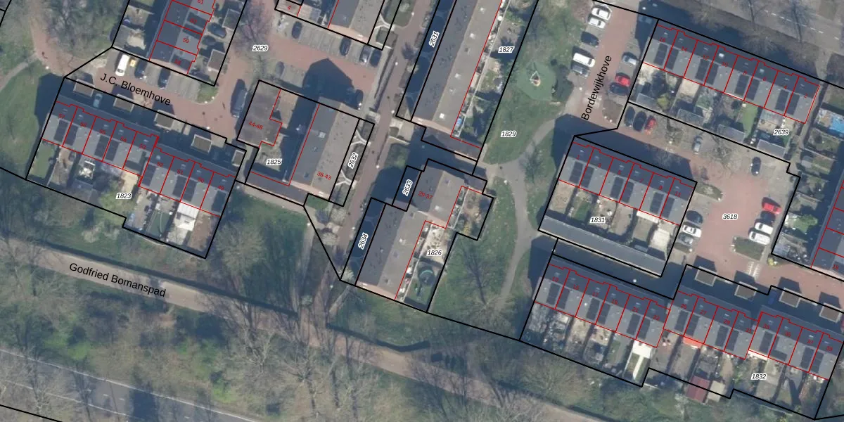 Het perceel waarop J.C. Bloemhove 33 staat heeft een oppervlakte van 615 m². Dit is een groot perceel. De perceeloppervlakte wordt geregistreerd door het Kadaster. Gedetailleerde informatie over de maten van dit perceel kunt u vinden in het rapport Kadastrale kaart met maatvoering van J.C. Bloemhove 33.