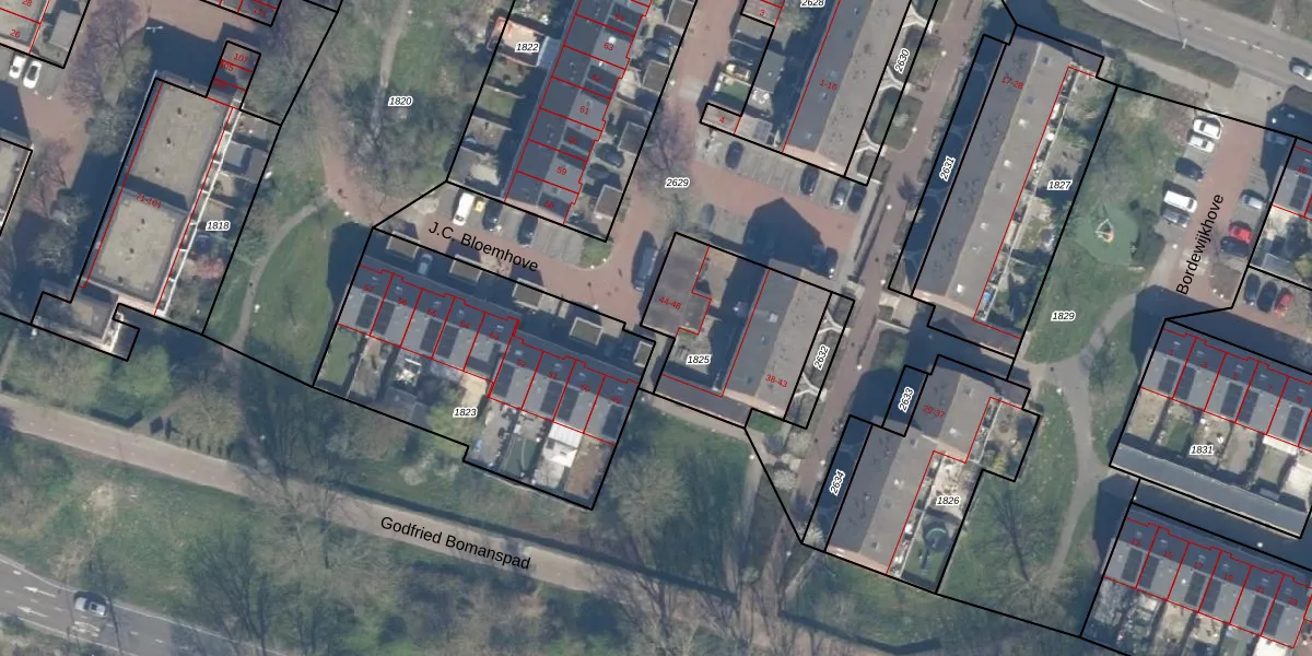 Het perceel waarop J.C. Bloemhove 48 staat heeft een oppervlakte van 550 m². Dit is een groot perceel. De perceeloppervlakte wordt geregistreerd door het Kadaster. Gedetailleerde informatie over de maten van dit perceel kunt u vinden in het rapport Kadastrale kaart met maatvoering van J.C. Bloemhove 48.