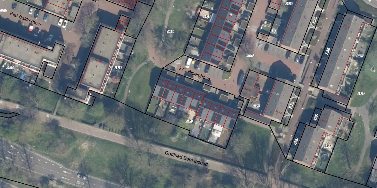 Het perceel waarop J.C. Bloemhove 54 staat heeft een oppervlakte van 1252 m². Dit is een zeer groot perceel. De perceeloppervlakte wordt geregistreerd door het Kadaster. Gedetailleerde informatie over de maten van dit perceel kunt u vinden in het rapport Kadastrale kaart met maatvoering van J.C. Bloemhove 54.