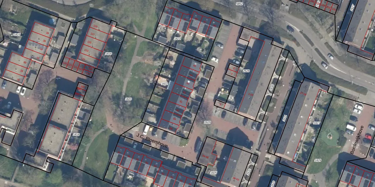 Het perceel waarop J.C. Bloemhove 62 staat heeft een oppervlakte van 1072 m². Dit is een zeer groot perceel. De perceeloppervlakte wordt geregistreerd door het Kadaster. Gedetailleerde informatie over de maten van dit perceel kunt u vinden in het rapport Kadastrale kaart met maatvoering van J.C. Bloemhove 62.