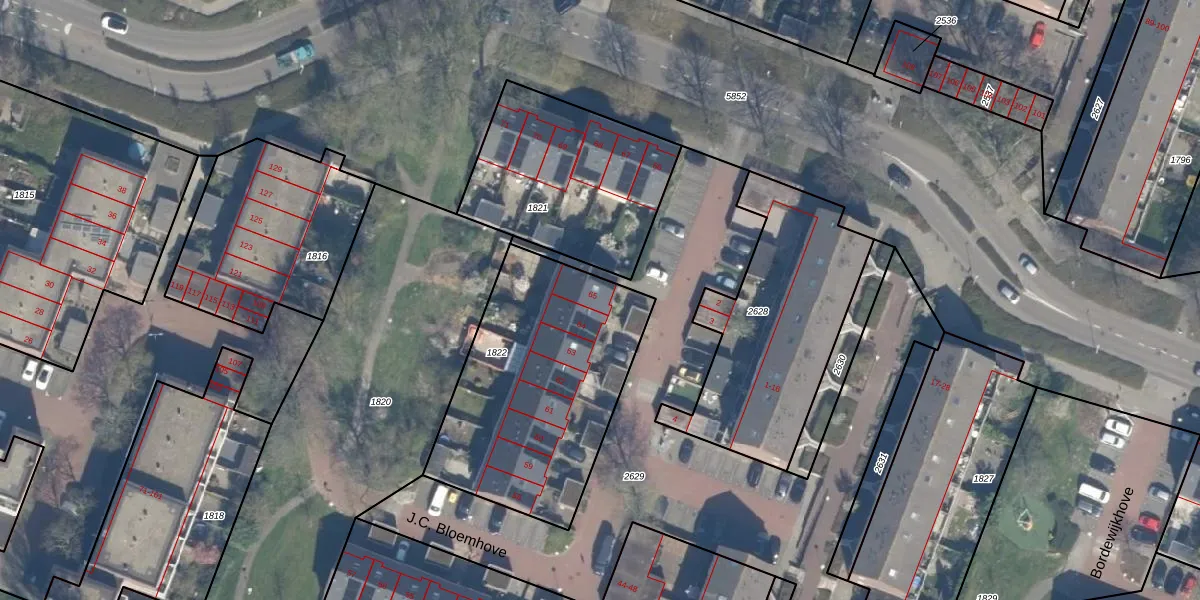 Het perceel waarop J.C. Bloemhove 65 staat heeft een oppervlakte van 1072 m². Dit is een zeer groot perceel. De perceeloppervlakte wordt geregistreerd door het Kadaster. Gedetailleerde informatie over de maten van dit perceel kunt u vinden in het rapport Kadastrale kaart met maatvoering van J.C. Bloemhove 65.