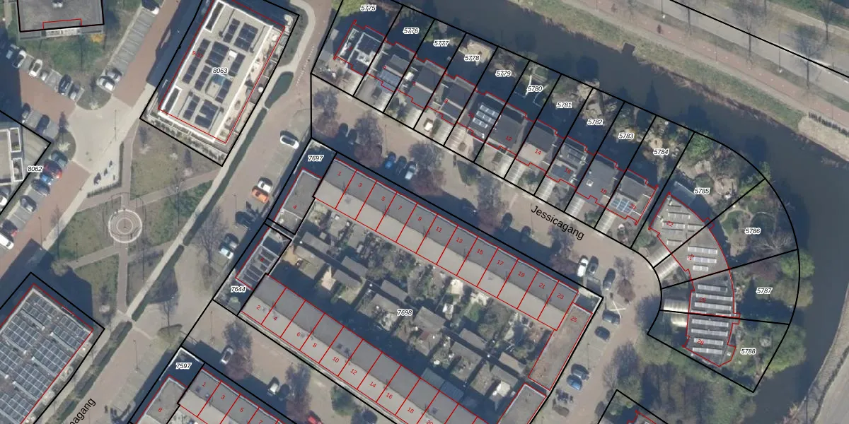 Het perceel waarop Jessicagang 9 staat heeft een oppervlakte van 3484 m². Dit is een zeer groot perceel. De perceeloppervlakte wordt geregistreerd door het Kadaster. Gedetailleerde informatie over de maten van dit perceel kunt u vinden in het rapport Kadastrale kaart met maatvoering van Jessicagang 9.