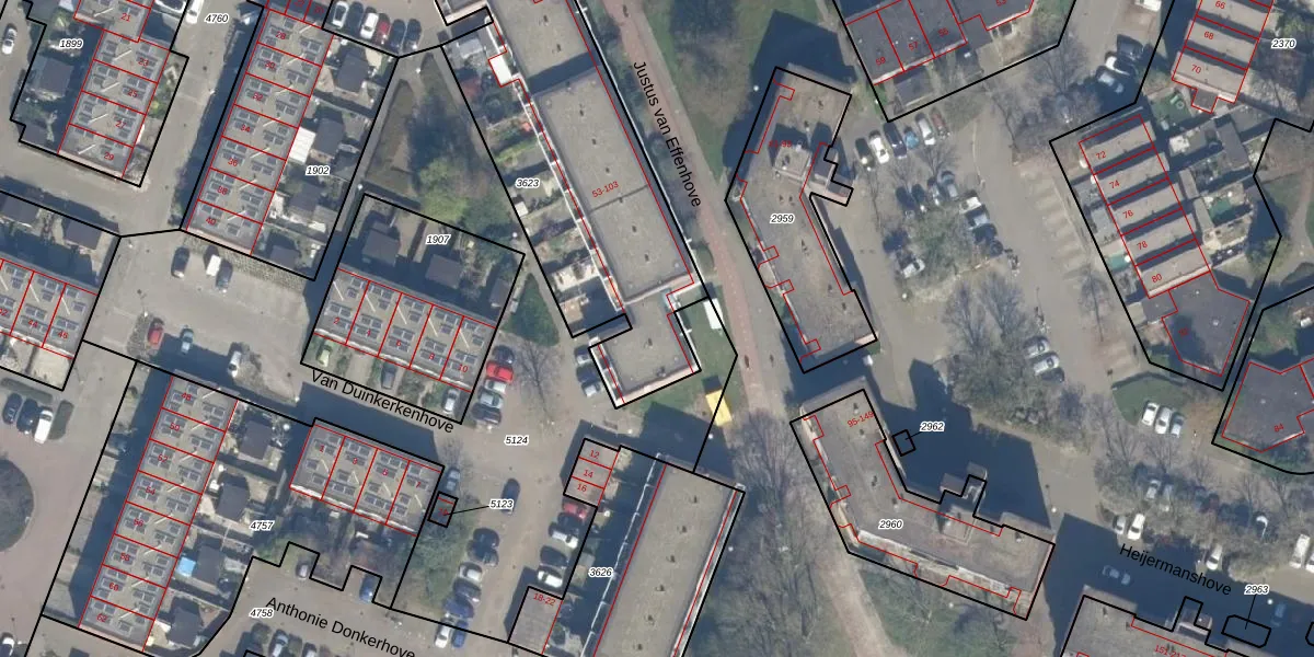 Het perceel waarop Justus van Effenhove 87 staat heeft een oppervlakte van 1326 m². Dit is een zeer groot perceel. De perceeloppervlakte wordt geregistreerd door het Kadaster. Gedetailleerde informatie over de maten van dit perceel kunt u vinden in het rapport Kadastrale kaart met maatvoering van Justus van Effenhove 87.