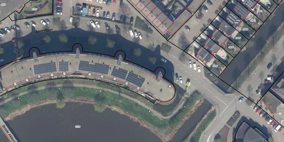 Het perceel waarop Juweellaan 40 staat heeft een oppervlakte van 5710 m². Dit is een zeer groot perceel. De perceeloppervlakte wordt geregistreerd door het Kadaster. Gedetailleerde informatie over de maten van dit perceel kunt u vinden in het rapport Kadastrale kaart met maatvoering van Juweellaan 40.