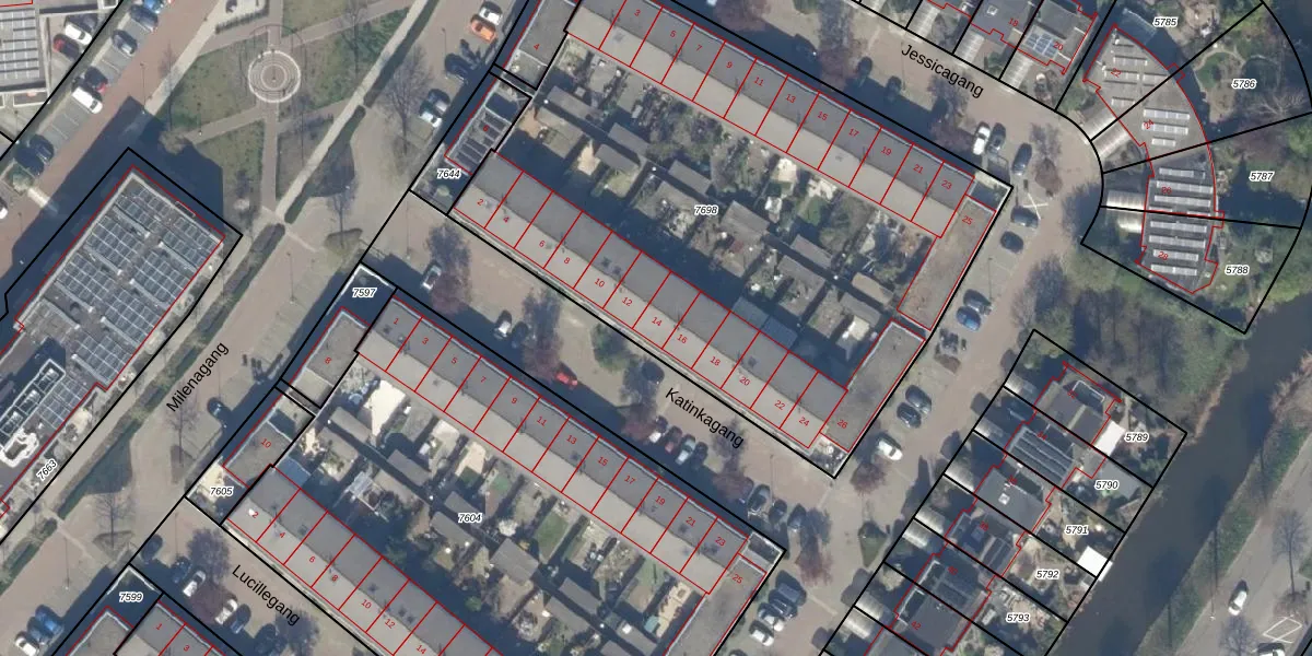 Het perceel waarop Katinkagang 14 staat heeft een oppervlakte van 3484 m². Dit is een zeer groot perceel. De perceeloppervlakte wordt geregistreerd door het Kadaster. Gedetailleerde informatie over de maten van dit perceel kunt u vinden in het rapport Kadastrale kaart met maatvoering van Katinkagang 14.