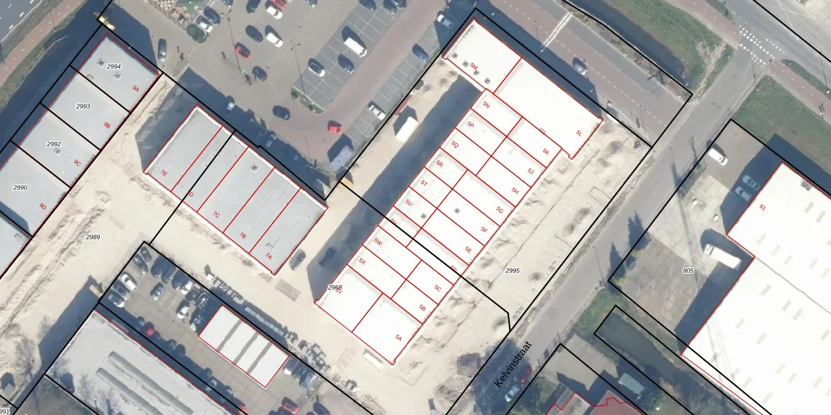 Het perceel waarop Kelvinstraat 5-U staat heeft een oppervlakte van 2882 m². Dit is een zeer groot perceel. De perceeloppervlakte wordt geregistreerd door het Kadaster. Gedetailleerde informatie over de maten van dit perceel kunt u vinden in het rapport Kadastrale kaart met maatvoering van Kelvinstraat 5-U.