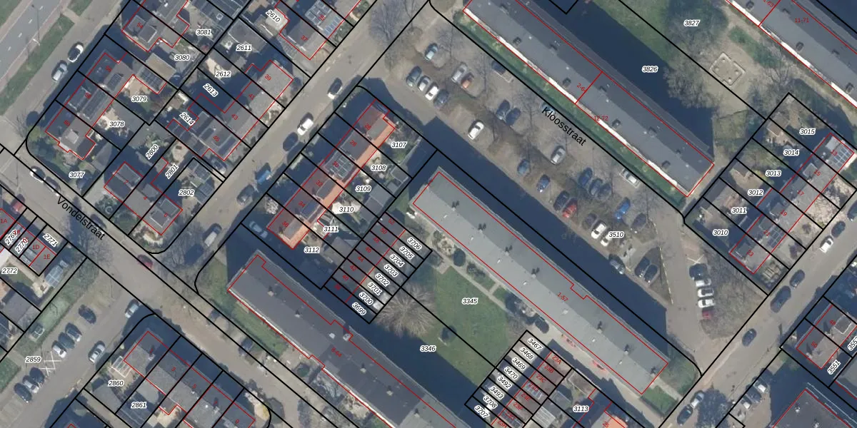 Het perceel waarop Kloosstraat 43 staat heeft een oppervlakte van 1884 m². Dit is een zeer groot perceel. De perceeloppervlakte wordt geregistreerd door het Kadaster. Gedetailleerde informatie over de maten van dit perceel kunt u vinden in het rapport Kadastrale kaart met maatvoering van Kloosstraat 43.