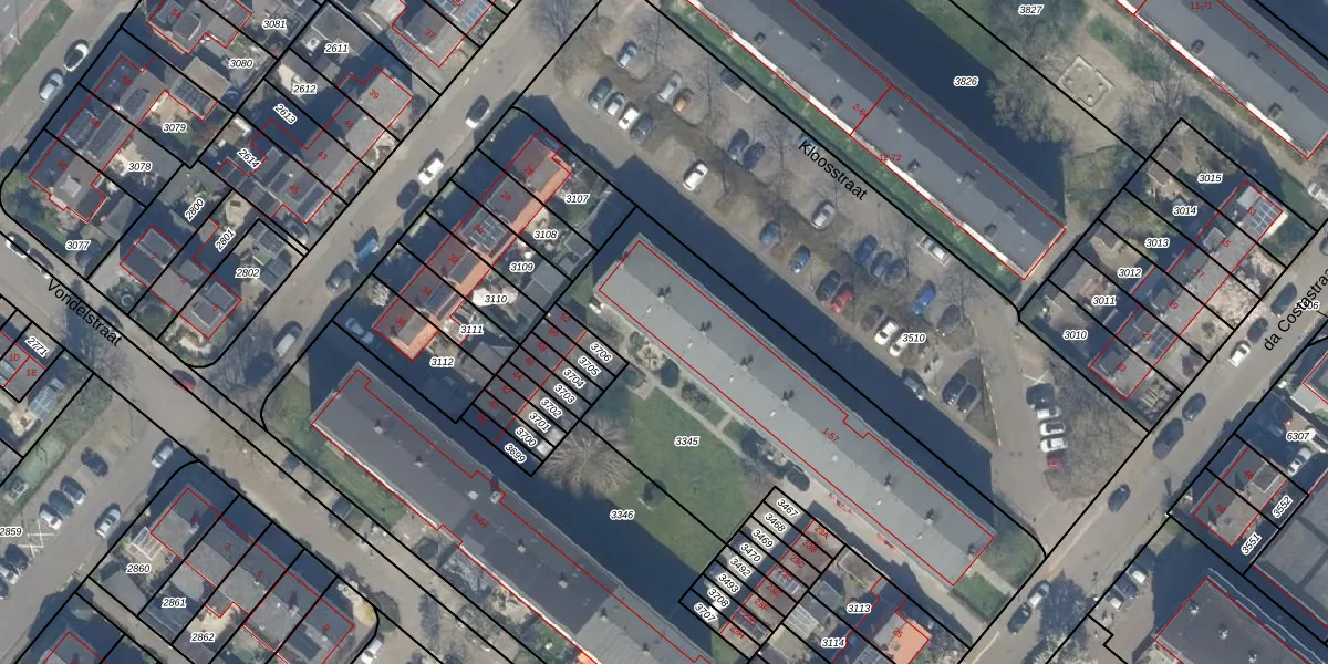 Het perceel waarop Kloosstraat 45 staat heeft een oppervlakte van 1884 m². Dit is een zeer groot perceel. De perceeloppervlakte wordt geregistreerd door het Kadaster. Gedetailleerde informatie over de maten van dit perceel kunt u vinden in het rapport Kadastrale kaart met maatvoering van Kloosstraat 45.