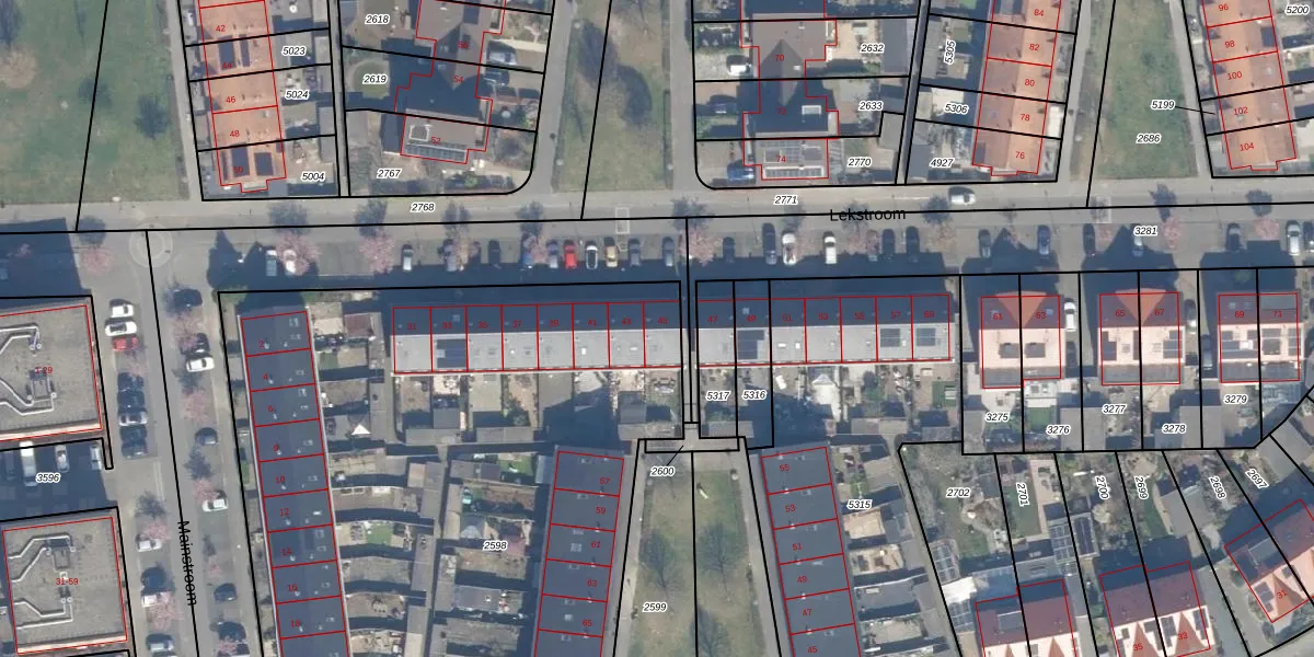 Het perceel waarop Lekstroom 45 staat heeft een oppervlakte van 4713 m². Dit is een zeer groot perceel. De perceeloppervlakte wordt geregistreerd door het Kadaster. Gedetailleerde informatie over de maten van dit perceel kunt u vinden in het rapport Kadastrale kaart met maatvoering van Lekstroom 45.