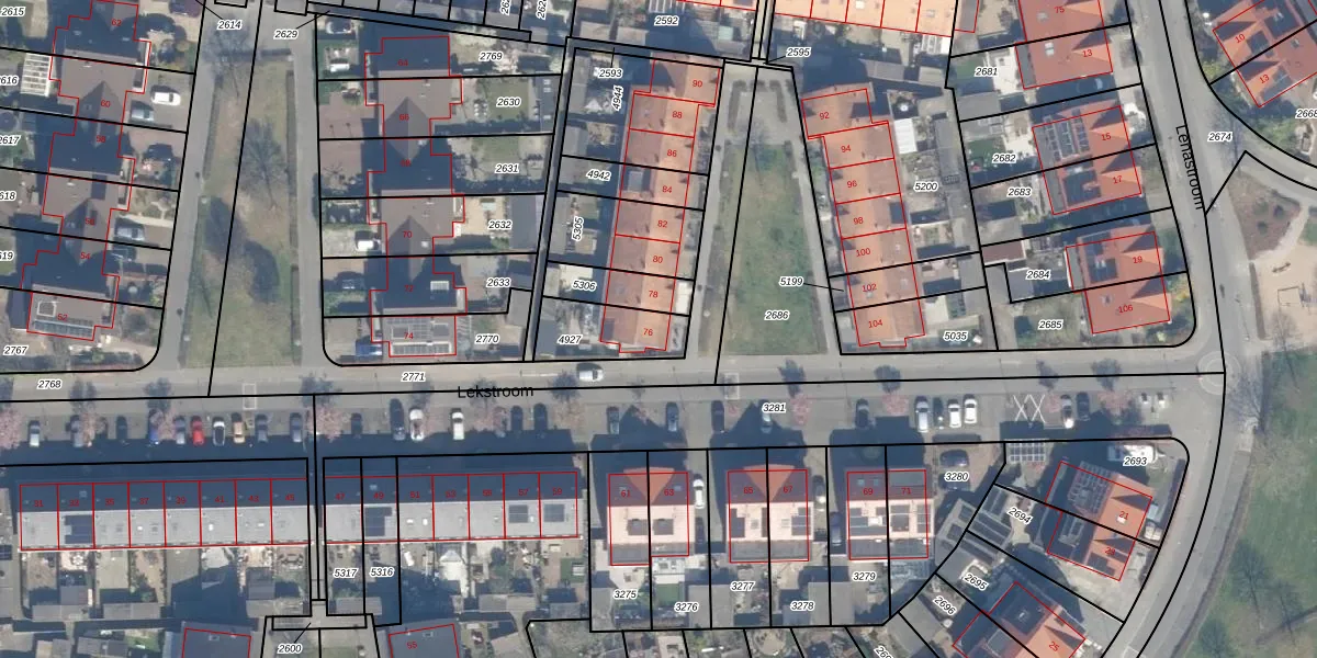 Het perceel waarop Lekstroom 76 staat heeft een oppervlakte van 187 m². Dit is een middelgroot perceel. De perceeloppervlakte wordt geregistreerd door het Kadaster. Gedetailleerde informatie over de maten van dit perceel kunt u vinden in het rapport Kadastrale kaart met maatvoering van Lekstroom 76.
