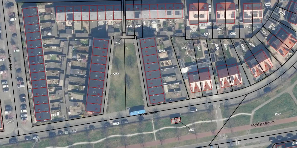 Het perceel waarop Lenastroom 47 staat heeft een oppervlakte van 1890 m². Dit is een zeer groot perceel. De perceeloppervlakte wordt geregistreerd door het Kadaster. Gedetailleerde informatie over de maten van dit perceel kunt u vinden in het rapport Kadastrale kaart met maatvoering van Lenastroom 47.