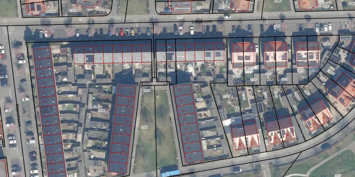 Het perceel waarop Lenastroom 55 staat heeft een oppervlakte van 1890 m². Dit is een zeer groot perceel. De perceeloppervlakte wordt geregistreerd door het Kadaster. Gedetailleerde informatie over de maten van dit perceel kunt u vinden in het rapport Kadastrale kaart met maatvoering van Lenastroom 55.