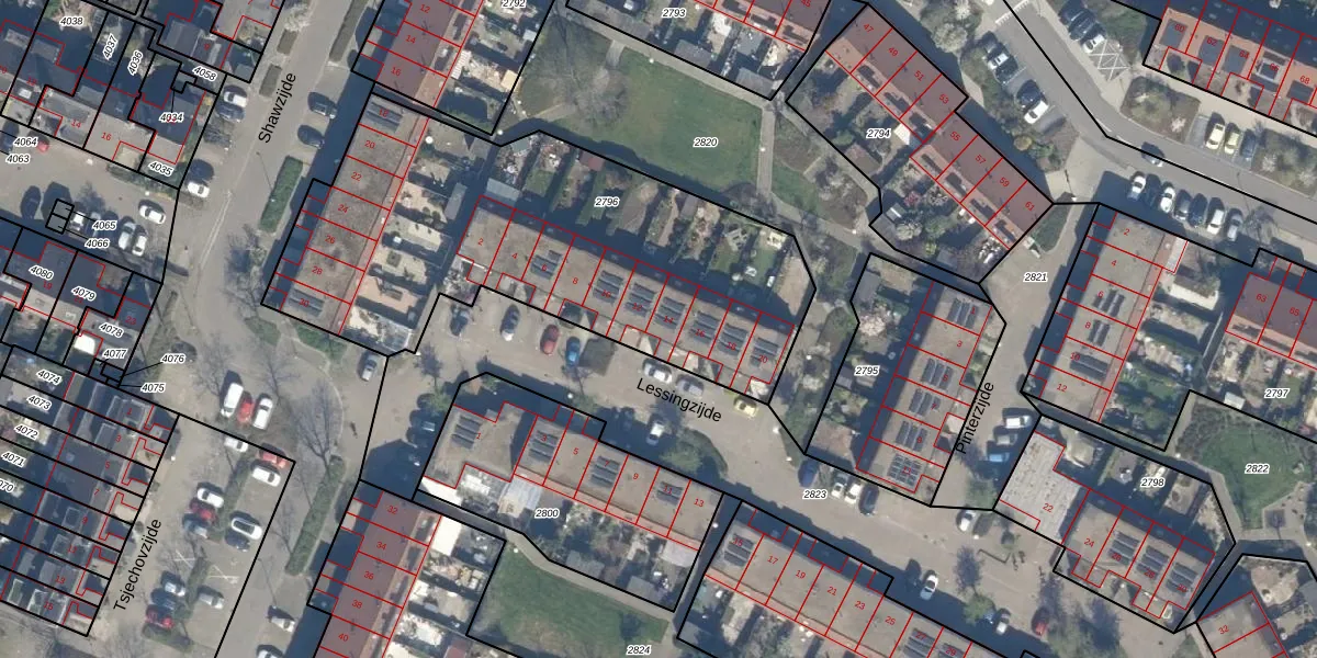 Het perceel waarop Lessingzijde 14 staat heeft een oppervlakte van 2115 m². Dit is een zeer groot perceel. De perceeloppervlakte wordt geregistreerd door het Kadaster. Gedetailleerde informatie over de maten van dit perceel kunt u vinden in het rapport Kadastrale kaart met maatvoering van Lessingzijde 14.