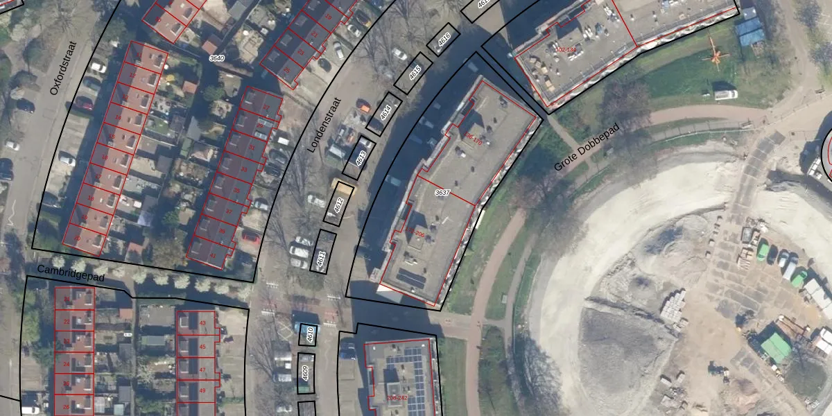 Het perceel waarop Londenstraat 172 staat heeft een oppervlakte van 1465 m². Dit is een zeer groot perceel. De perceeloppervlakte wordt geregistreerd door het Kadaster. Gedetailleerde informatie over de maten van dit perceel kunt u vinden in het rapport Kadastrale kaart met maatvoering van Londenstraat 172.