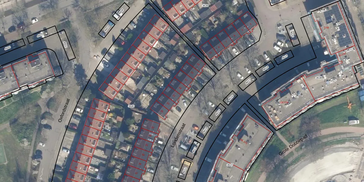 Het perceel waarop Londenstraat 19 staat heeft een oppervlakte van 5381 m². Dit is een zeer groot perceel. De perceeloppervlakte wordt geregistreerd door het Kadaster. Gedetailleerde informatie over de maten van dit perceel kunt u vinden in het rapport Kadastrale kaart met maatvoering van Londenstraat 19.