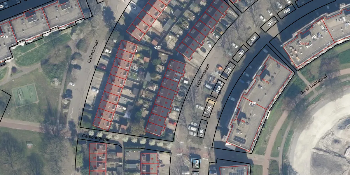 Het perceel waarop Londenstraat 31 staat heeft een oppervlakte van 5381 m². Dit is een zeer groot perceel. De perceeloppervlakte wordt geregistreerd door het Kadaster. Gedetailleerde informatie over de maten van dit perceel kunt u vinden in het rapport Kadastrale kaart met maatvoering van Londenstraat 31.